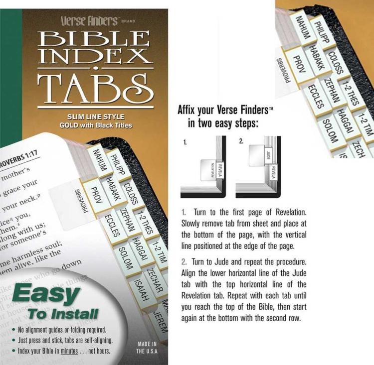 $5.78Bible Indexing Tabs Gold Edged 80 Pcs Tabbies(R) Bible Indexing Tabs are the best selling tab for THE best seller! Tab any size Bible with these pre-cut, self-adhesive tabs. Permanent adhesive; won’t fall off. Tabs are printed on both sides for easy reading and quick reference. Easy-to-follow instructions and Tab Positioning Guide included in each package.
